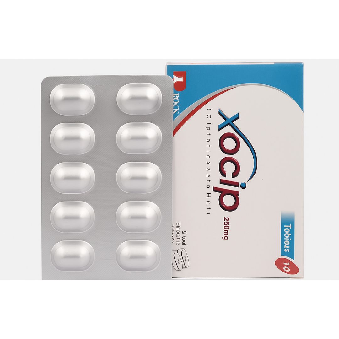 Xocip 250 mg; works by inhibiting an enzyme required for the bacteria to make its own copies and cause serious infections.
